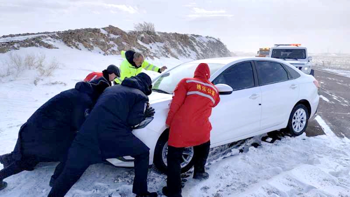 经了解,该被困车辆由阿拉山口驶向塔城方向,因持续性刮风天气影响,加之操作不慎等因素,车辆驶入路边积雪导致被困,无法正常行驶。得知情况后,分局防雪保交通人员一边与交通警察、交通运输综合执法等部门人员一起疏导被困人员情绪,一边及时运用防雪保交通指挥车辆中的备用铁锹、推板等工具,主动帮助被困车辆清除车身及轮胎底部积雪。约半小时后,在现场人员的共同努力下,通过车辆牵引和人工助推等方式,该被困车辆终于脱困,缓缓驶出积雪区域。分局防雪保交通人员主动热情救助被困车辆,不仅是公路人努力为群众出行保驾护航的生动体现,也充分展示了新时代公路人的良好精神面貌。