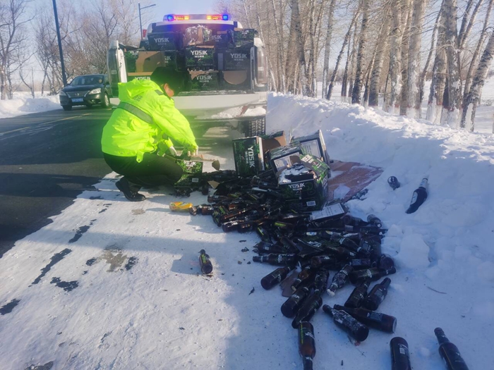 2月20日,哈巴河执法大队公路巡查中发现,国道331线9223-9224路段有多处箱装啤酒瓶堆放在公路左侧,严重影响了公路通行安全。巡查人员在零下35度的严寒里,将堆放路面的40余箱啤酒瓶装至巡查车,并对酒瓶碎片进行了清理,及时保障了公路的安全畅通。目前,巡查人员已联系交警部门查找违法车辆及人员相关信息。