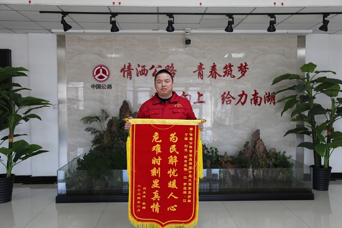 2月29 日,南湖公路分局收到了一面印有“危难时刻显真情 为民解忧暖人心”的锦旗。这是顺利返乡的刘克洋表达对南湖公路分局大南湖养护站丁强、刘俊、阿布来提江·赛买提、阿不都沙拉木·阿不力孜等同志不畏风雪在危难之时救助的感激之情。