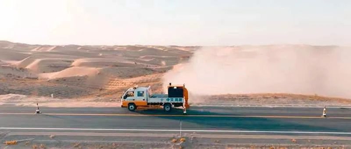 中交新疆交通投资发展有限公司养护部门在S254尉且沙漠公路多组同步作业,快速清理路面积沙,确保沙漠公路安全畅通。