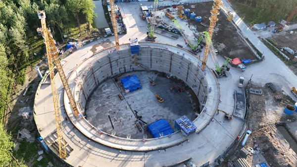 张靖皋长江大桥北航道桥南锚碇采用三角框架重力式锚,基础为外径90米、墙厚1.5米的圆形地连墙支护结构。锚碇基坑开挖深度21.3米,开挖直径88.5米,开挖方量约130959立方米,竖向分9层开挖(含帽梁)。
