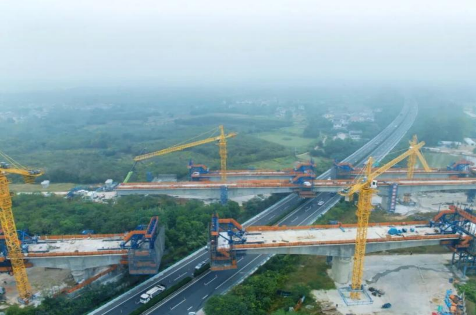 宁淮城际铁路左线六合特大桥跨205国道连续梁全长177.7米,主跨80米,采用挂篮悬臂现浇法,分10个标准节段依次浇筑施工,浇筑混凝土总方量达1900立方米。该连续梁上跨交通繁忙的205国道,车流量大,交通疏导和管制压力大,施工风险高。为保证连续梁顺利合龙浇筑,项目部编制多个专项施工方案。桥梁主体施工采用挂篮兜底防护网片临边防护,合龙段、挂篮拆除等危大工序对施工区域下方交通进行封闭导改,确保行车安全。